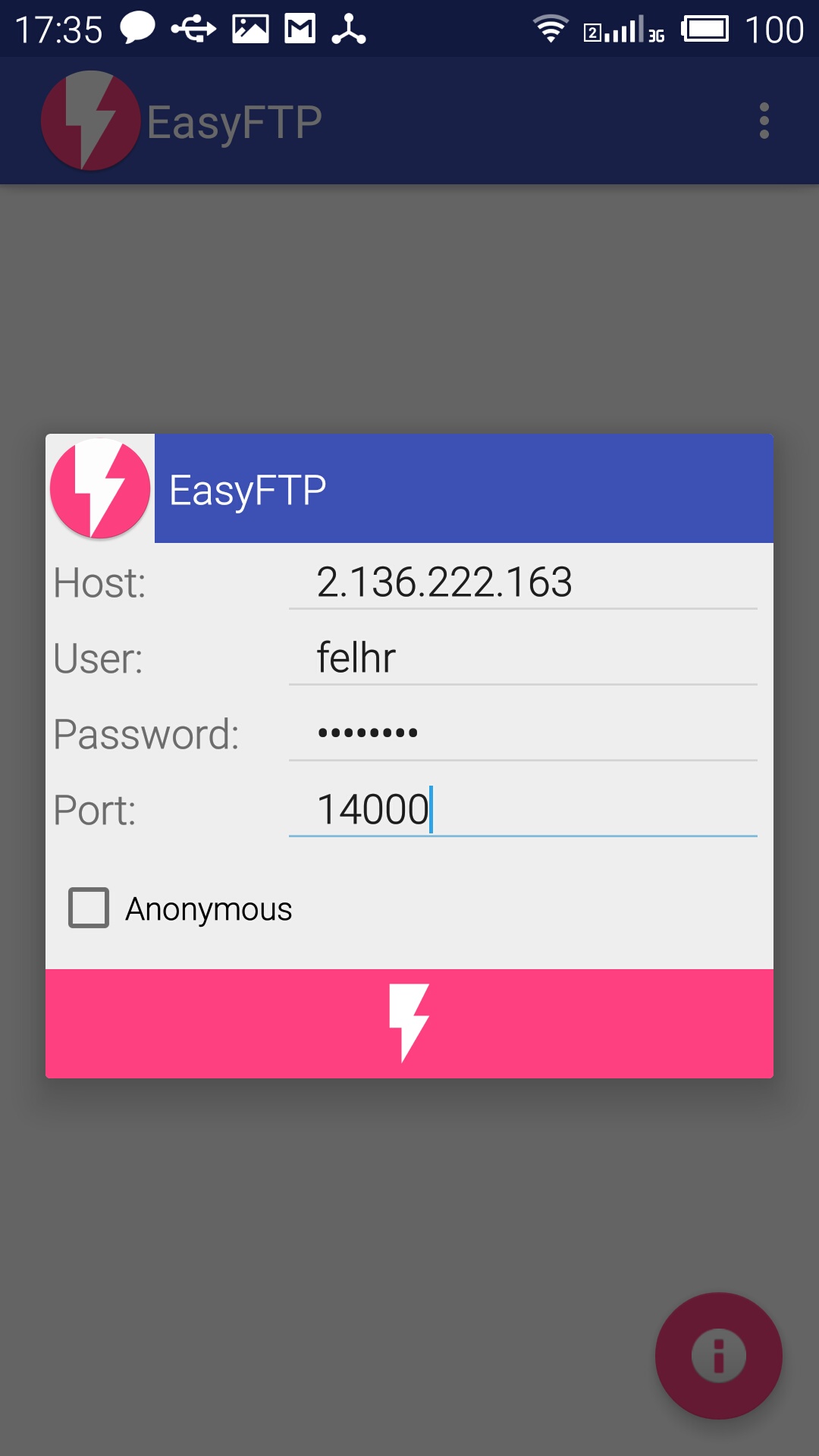 A simple dialog with fields for host, user, password and port (if empty will use port 21).